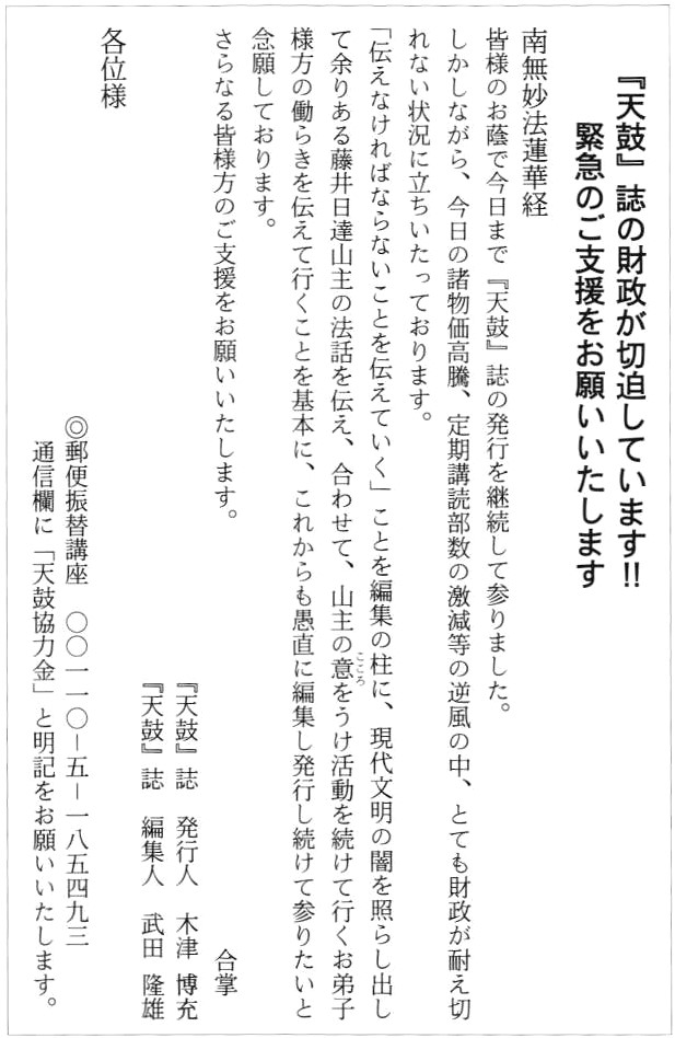 「南無妙法蓮華経と唱えて平和憲法を守ります」とおおせられた御師匠様のお言葉を今 一度かみじめ、困難の中ではありますが、さらに精進を重ねてまいりましょう。
